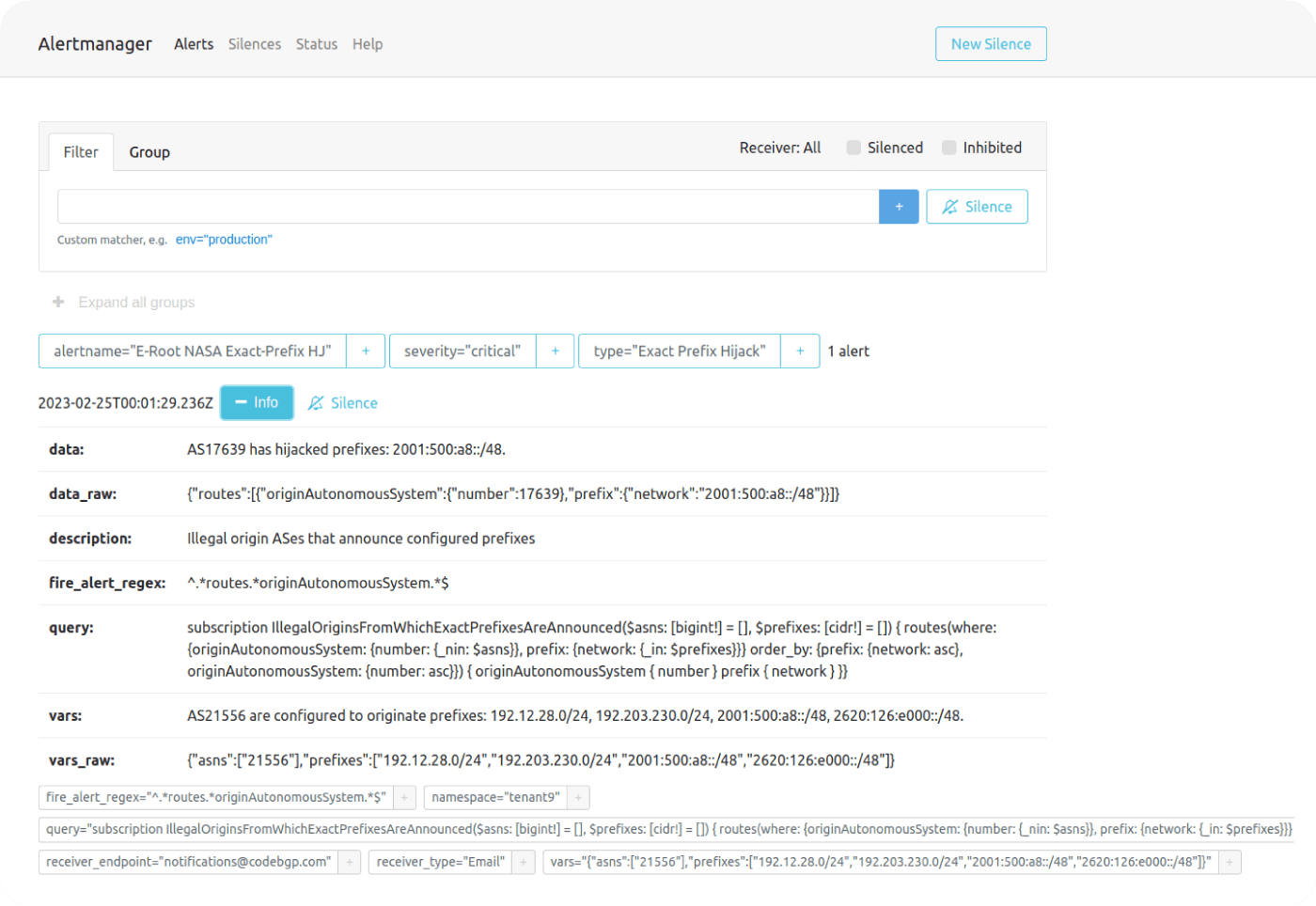 The Code BGP alertmanager API/UI is exposed under https://<tenant>-api.codebgp.com/alerts. Please consult Code BGP team