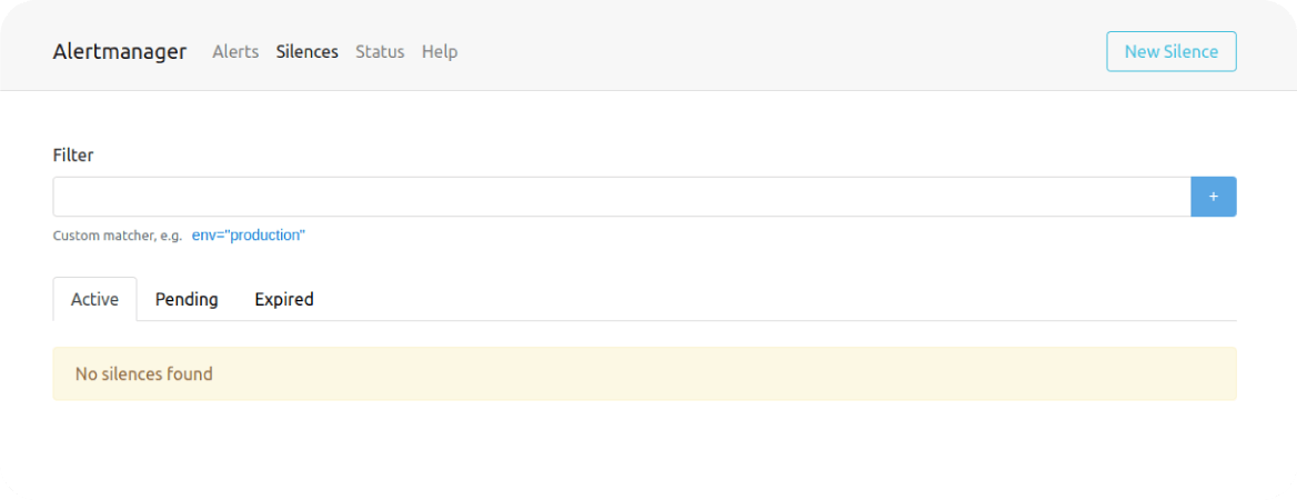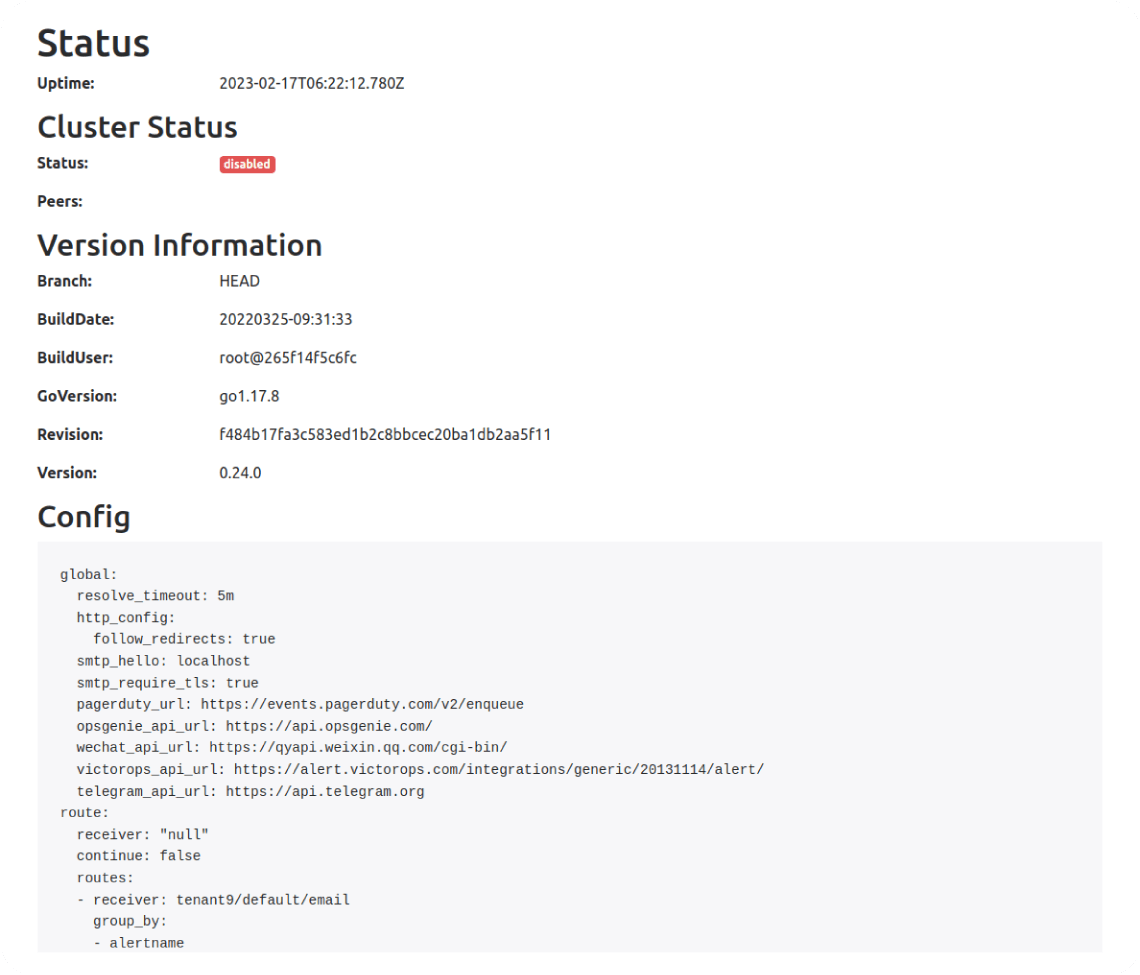 Current status and configuration of alertmanager can be viewed in the Status page: