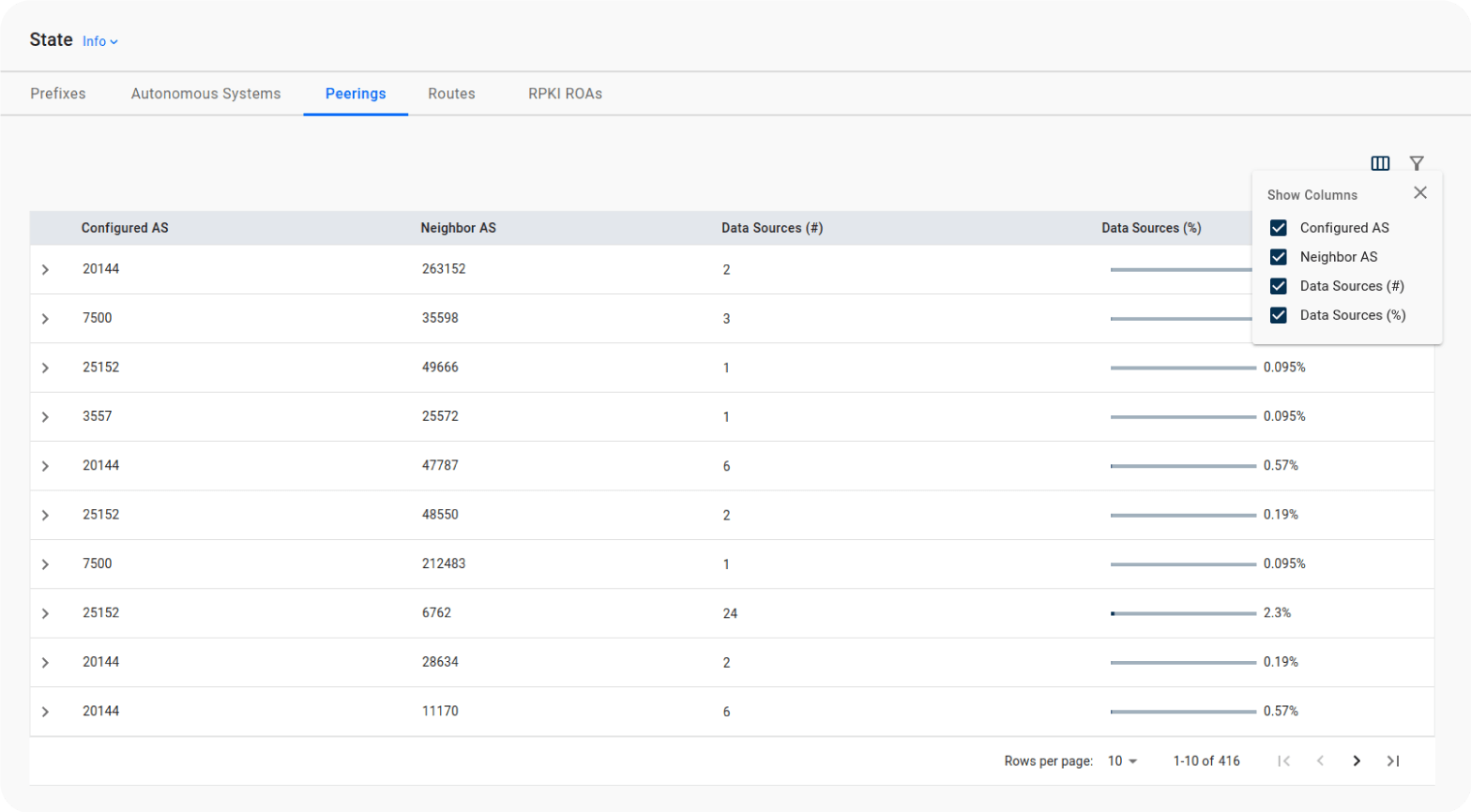 Data Sources (%) shows the ratio of peers that have seen each Peering to the total number of active peers that could potentially see it.