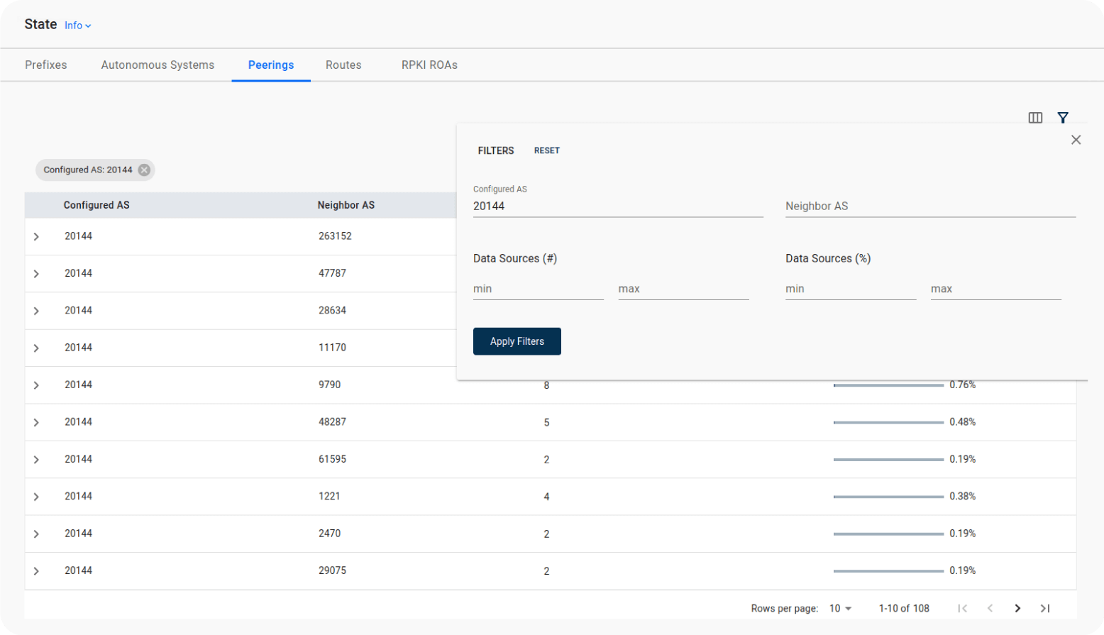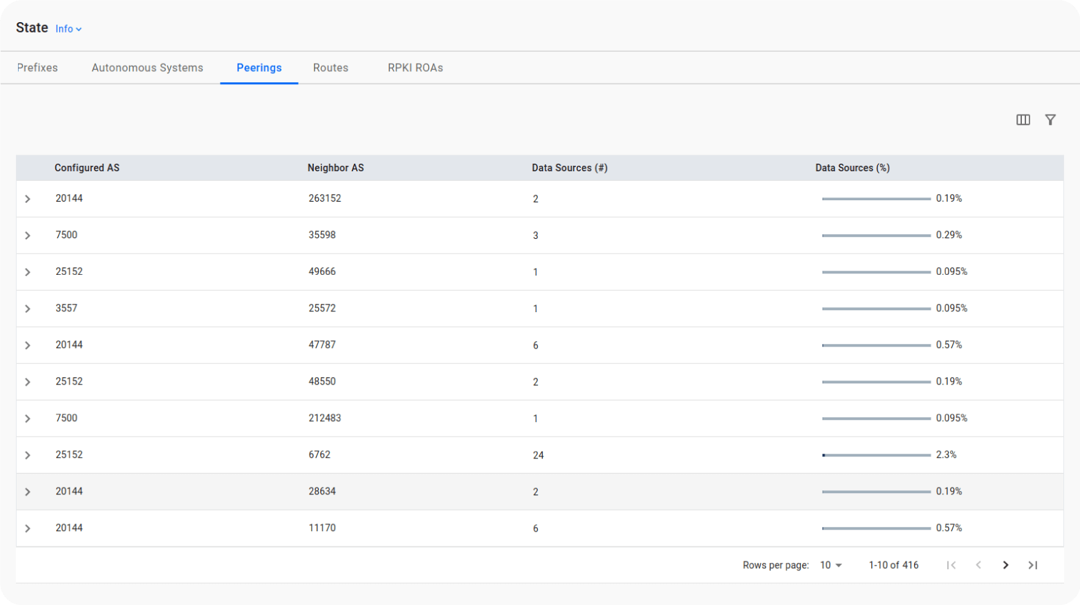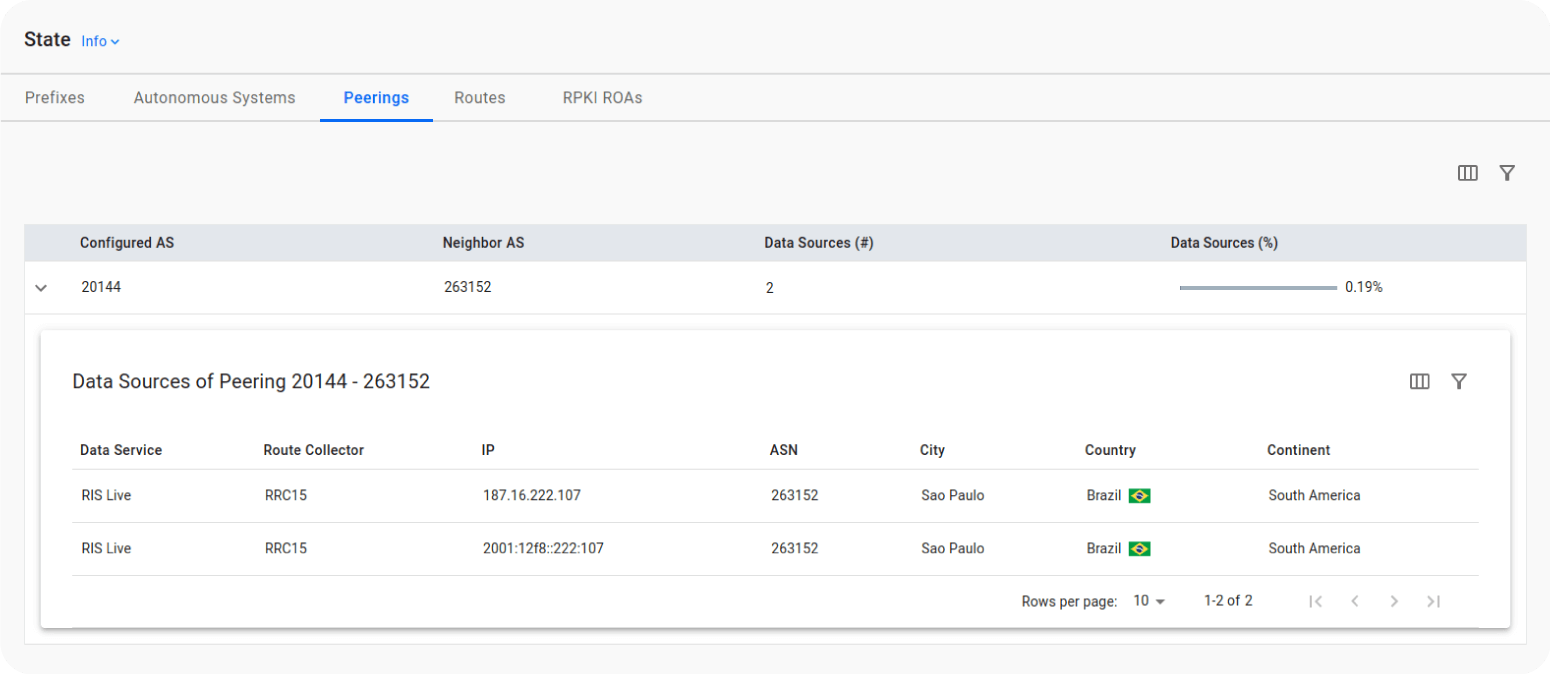 Finally, each Peering row is expandable and exhibits an inner table with all data sources that see the peering. The inner data source table can be filtered (and CSV-exported) based on the following fields: