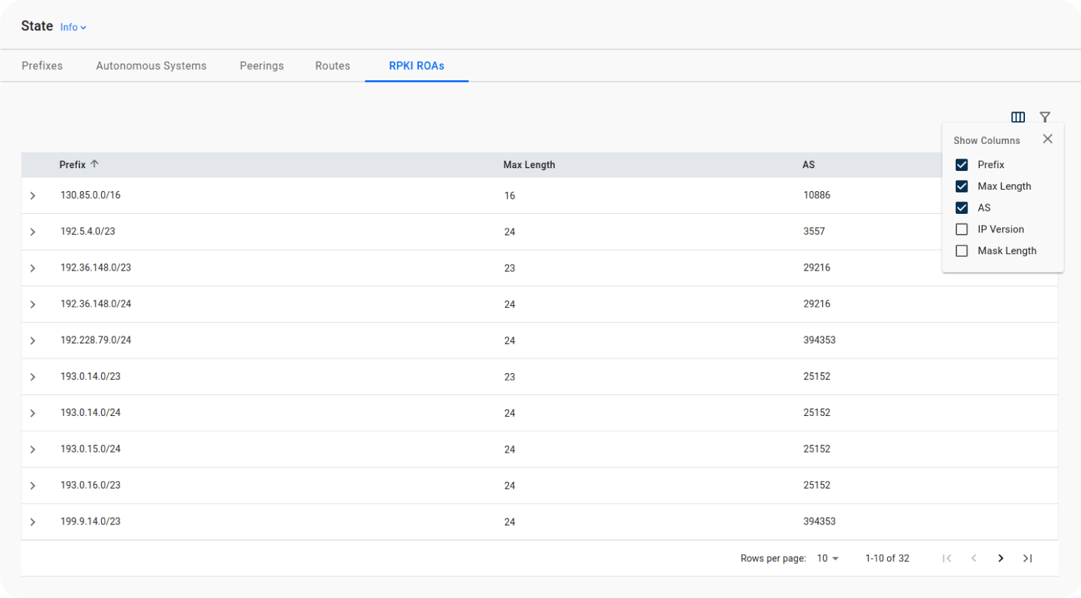 Click on Show Columns to hide unwanted data columns or reveal additional ones (IP Version and Mask Length).
