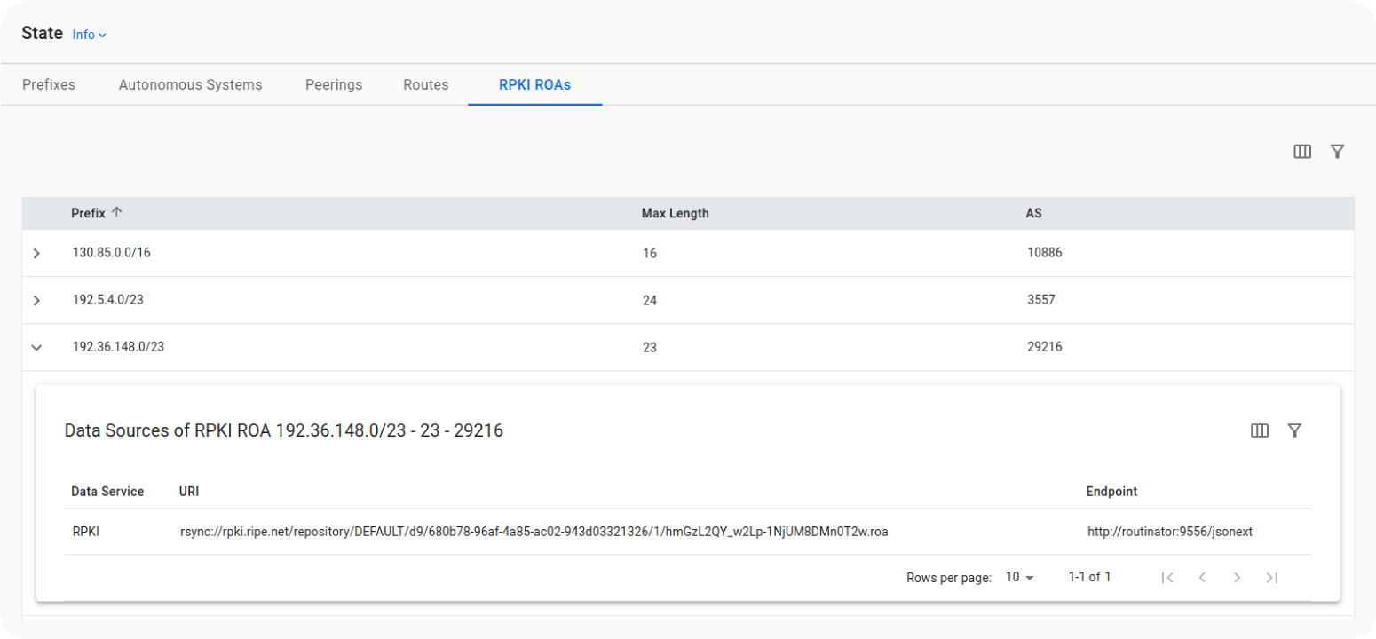 Finally, each RPKI ROA row is expandable and exhibits an inner table with all data sources that see the ROA. The inner data source table can be filtered (and CSV-exported) based on the following fields: