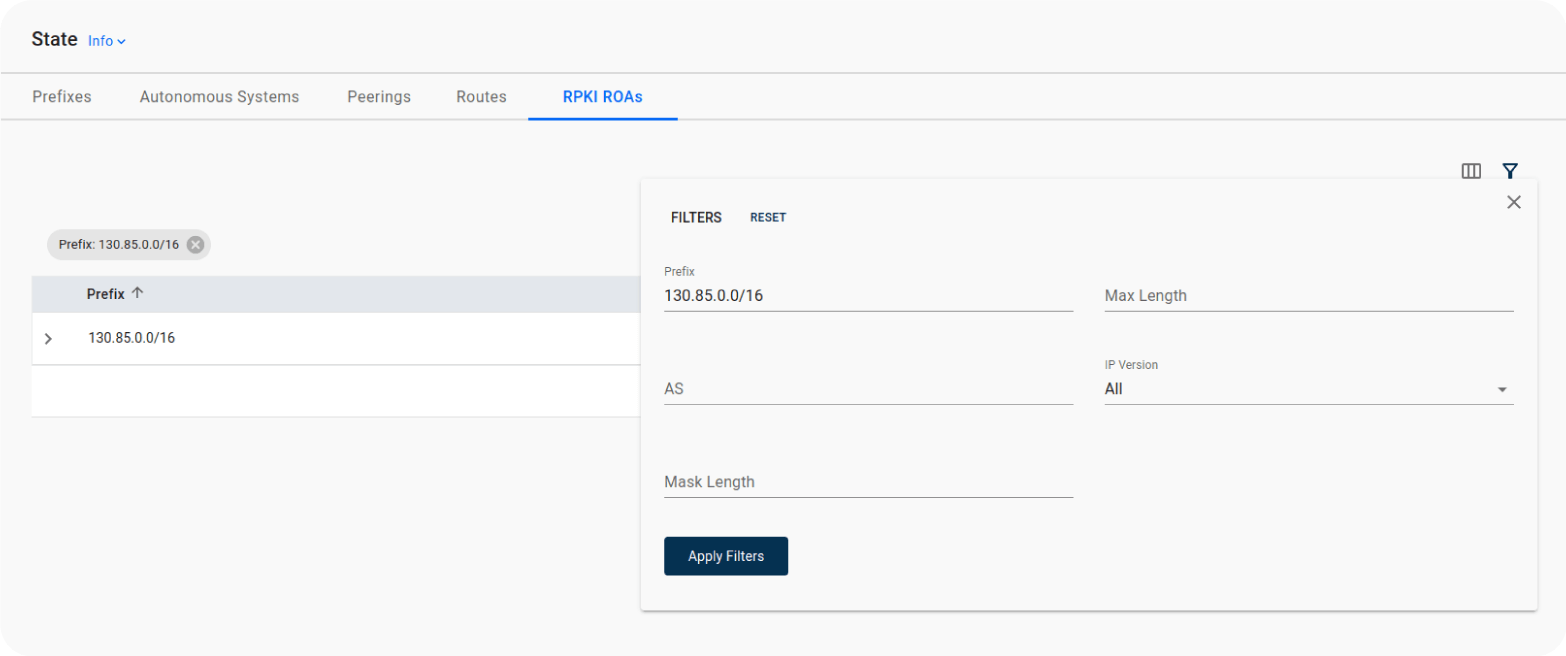 Use the table filters to filter RPKI ROAS based on all available fields.