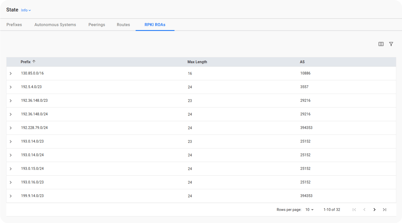 Table view of active RPKI ROAS, related to the AS filters you have configured in Setup | AS Filters.