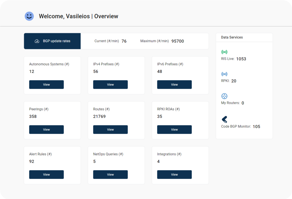 In the Integrations page, you can view the integrations we support and read up on their documentation. These include instances of Alertmanager (for real-time alerts), Grafana (for visualizations and dashboards), Prometheus (for metrics) and Loki (for logs, incl. BGP updates).