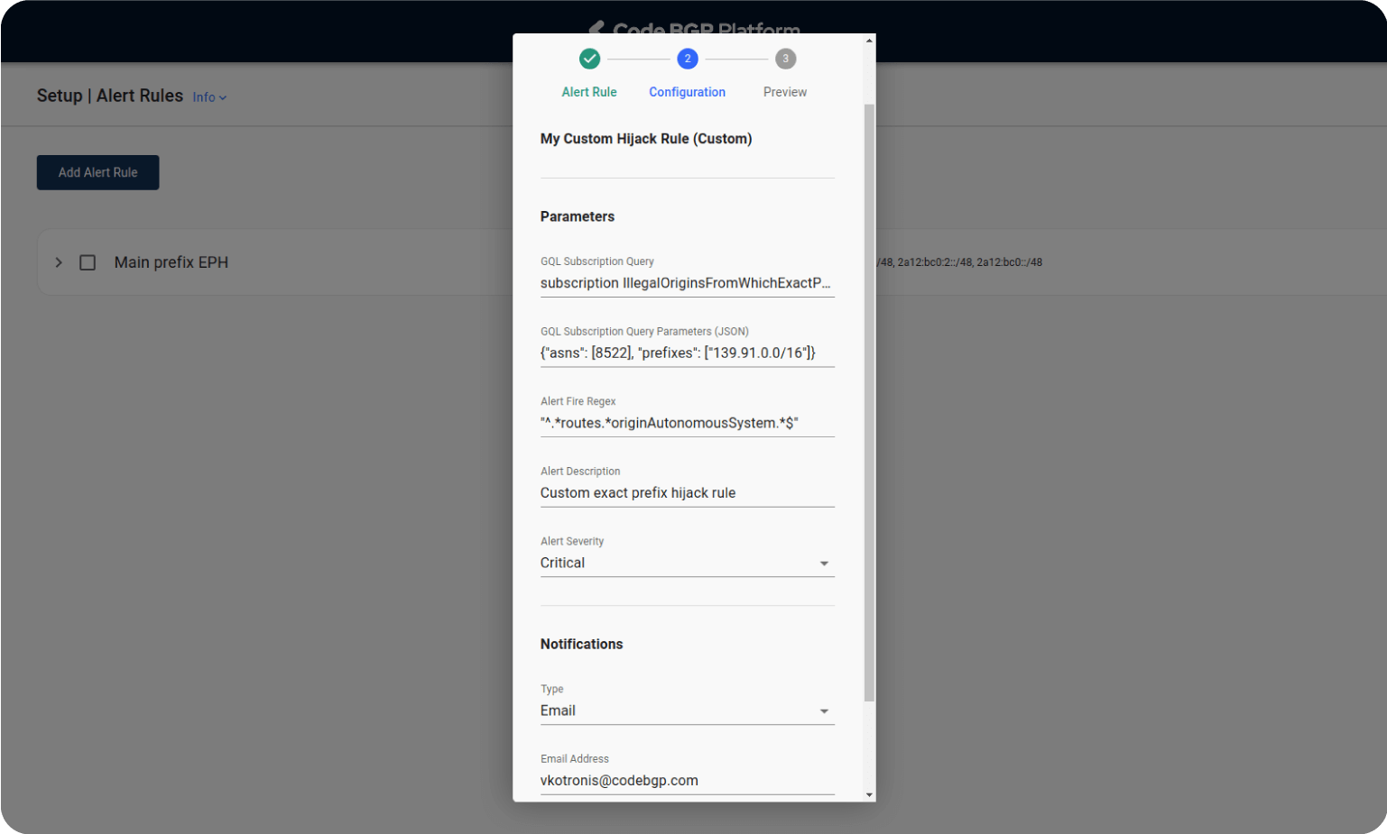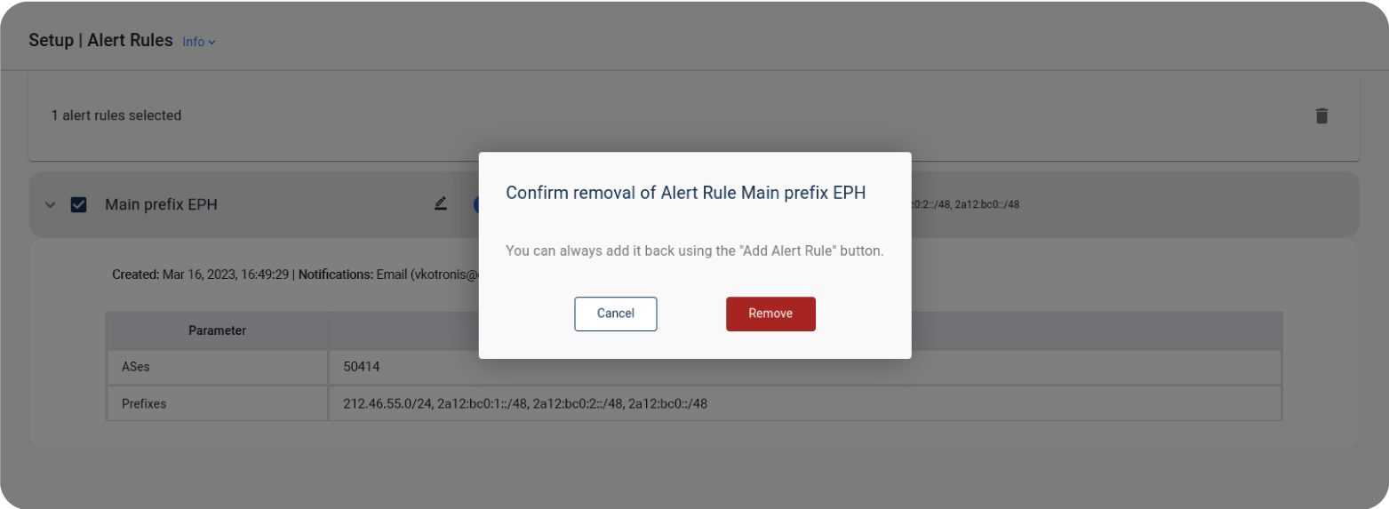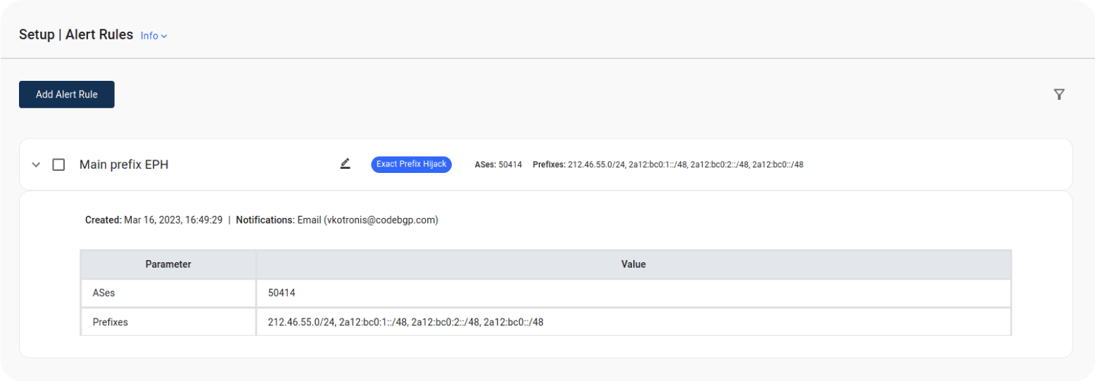Alert rules can be configured with different parameters, like different type, origin ASes, neighbors, prefixes and notification channel options. Note that for correct alerting operation, you should setup properly your prefix filters besides the AS filters.