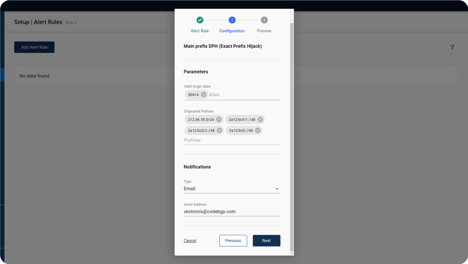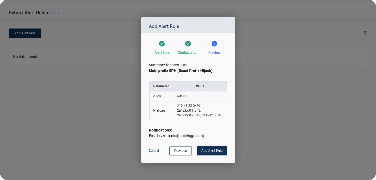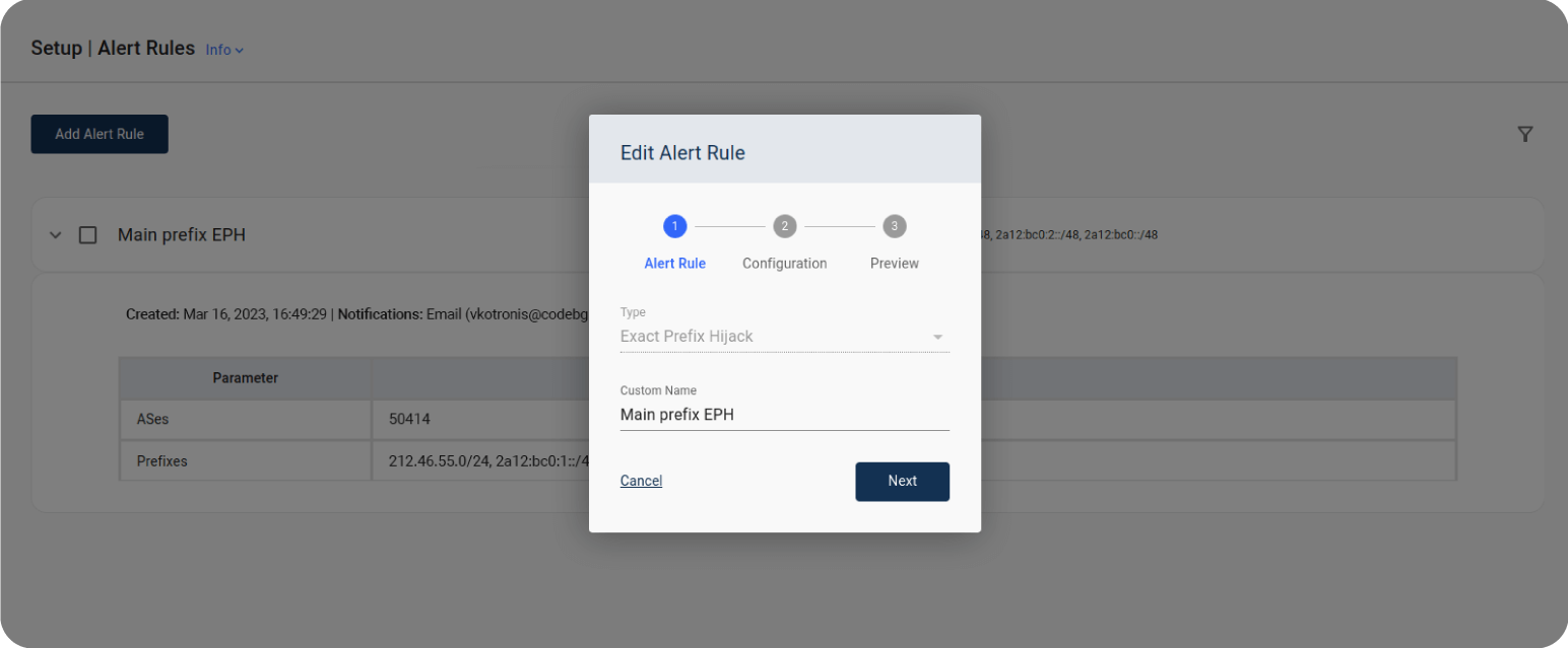 Alert rules can be configured with different parameters, like different type, origin ASes, neighbors, prefixes and notification channel options. Note that for correct alerting operation, you should setup properly your prefix filters besides the AS filters.