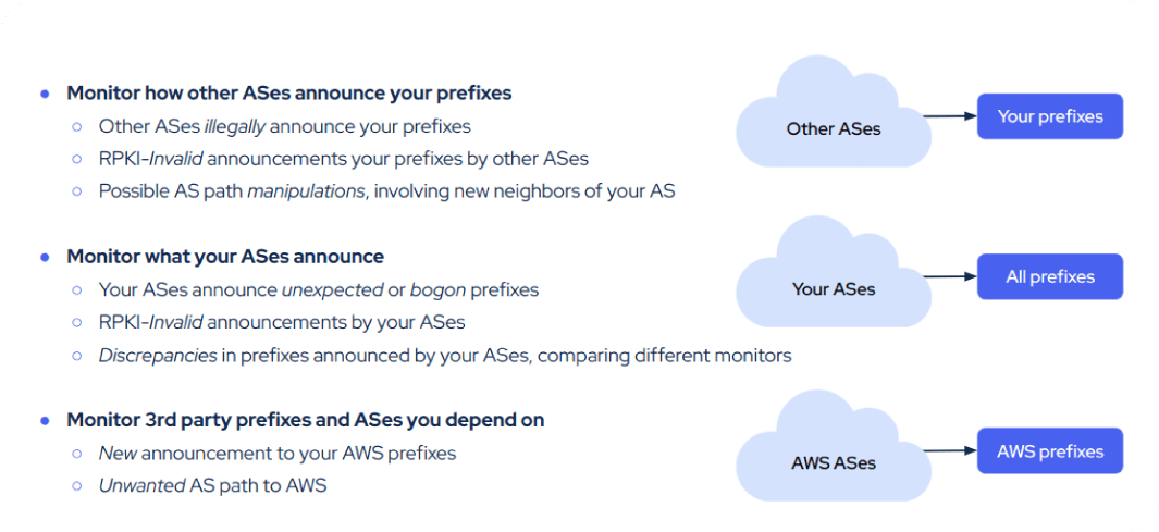 | RPKI-Invalid Detection | Critical | RPKI-Invalid announcements of configured prefixes by other ASes. |