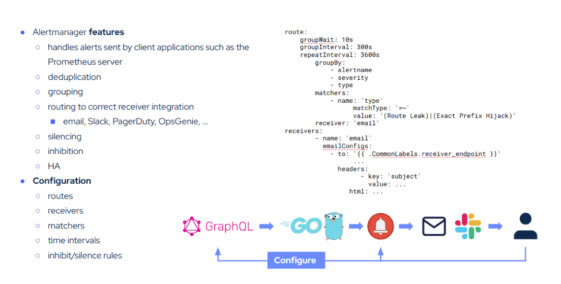 Using our powerful BGPQL API we can subscribe to alertable BGP data and trigger alerts on demand when corresponding state data is detected via regexes, within seconds. Rules are in place to generate alerts according to user preferences. The data pipeline we employ for this is: Persistent State --> GraphQL --> Custom Alerts Provider --> Alertmanager|Persistent State --> Notification channel(s). Note that when the state data stops being alertable (i.e., the regex matches stop firing), alerts are automatically resolved. See also this page for more details on the displayed alerts via the Alertmanager, and this page for more details on the persistently stored (active or resolved) alerts.