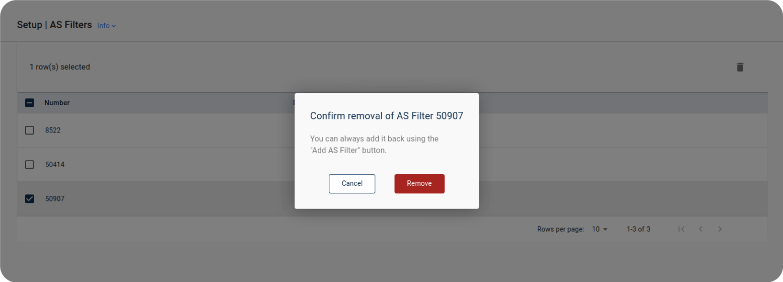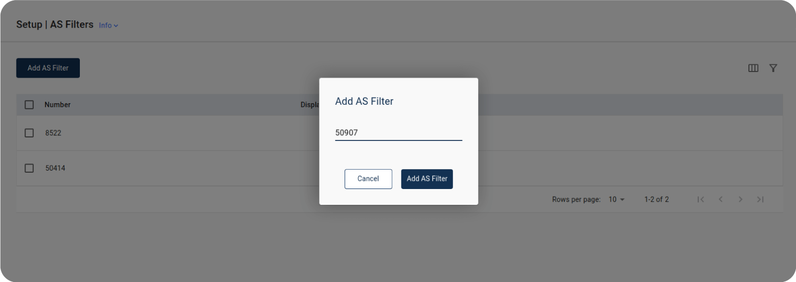 Set the AS(es) [Autonomous System(s)] you want to monitor. Click on Add AS Filter to add a new AS Filter. You can switch off the Displayed toggle next to each AS if you want to stop viewing data from it. However, the AS will keep being monitored. To remove an AS you do not want to monitor anymore, select it and click Delete.