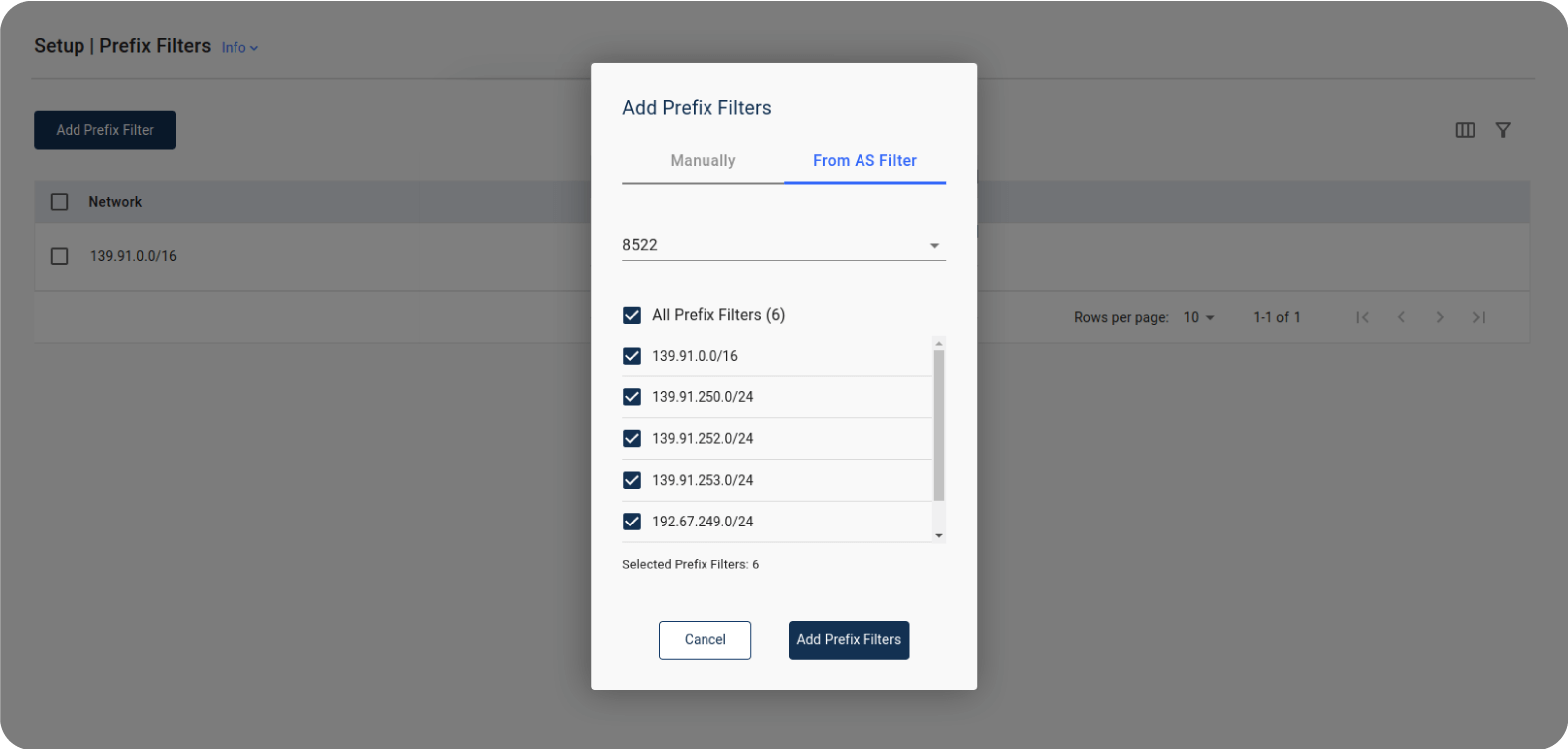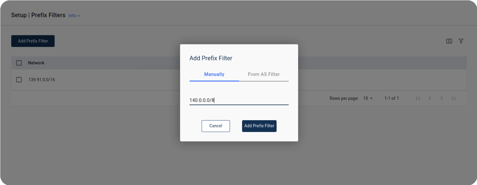 Prefix filters accept route announcements with a given prefix, regardless of origin AS. They can be set either manually by typing them in CIDR format, or they can be automatically created in bulk by the Platform, which detects the prefixes originated by defined AS filters.